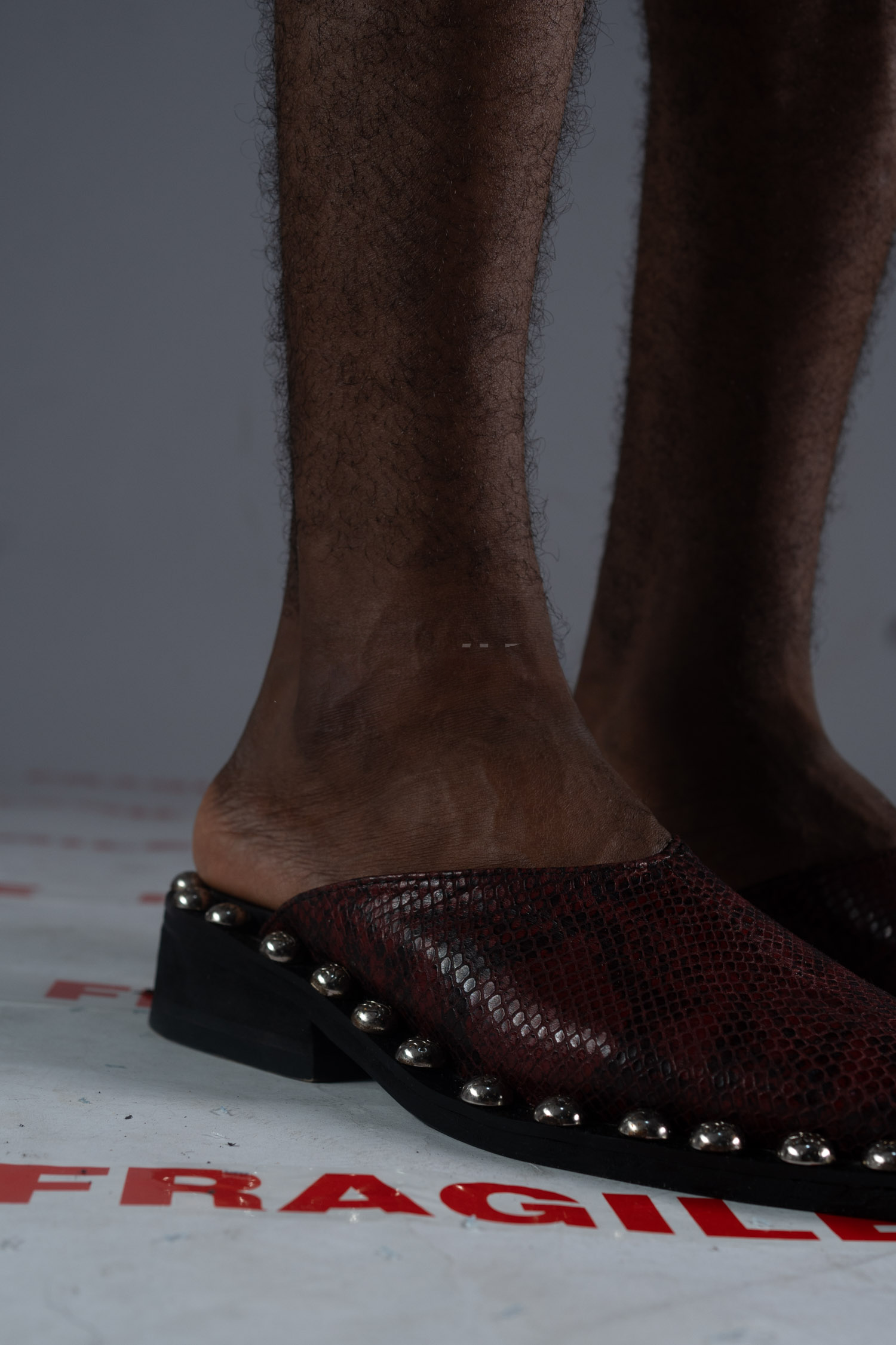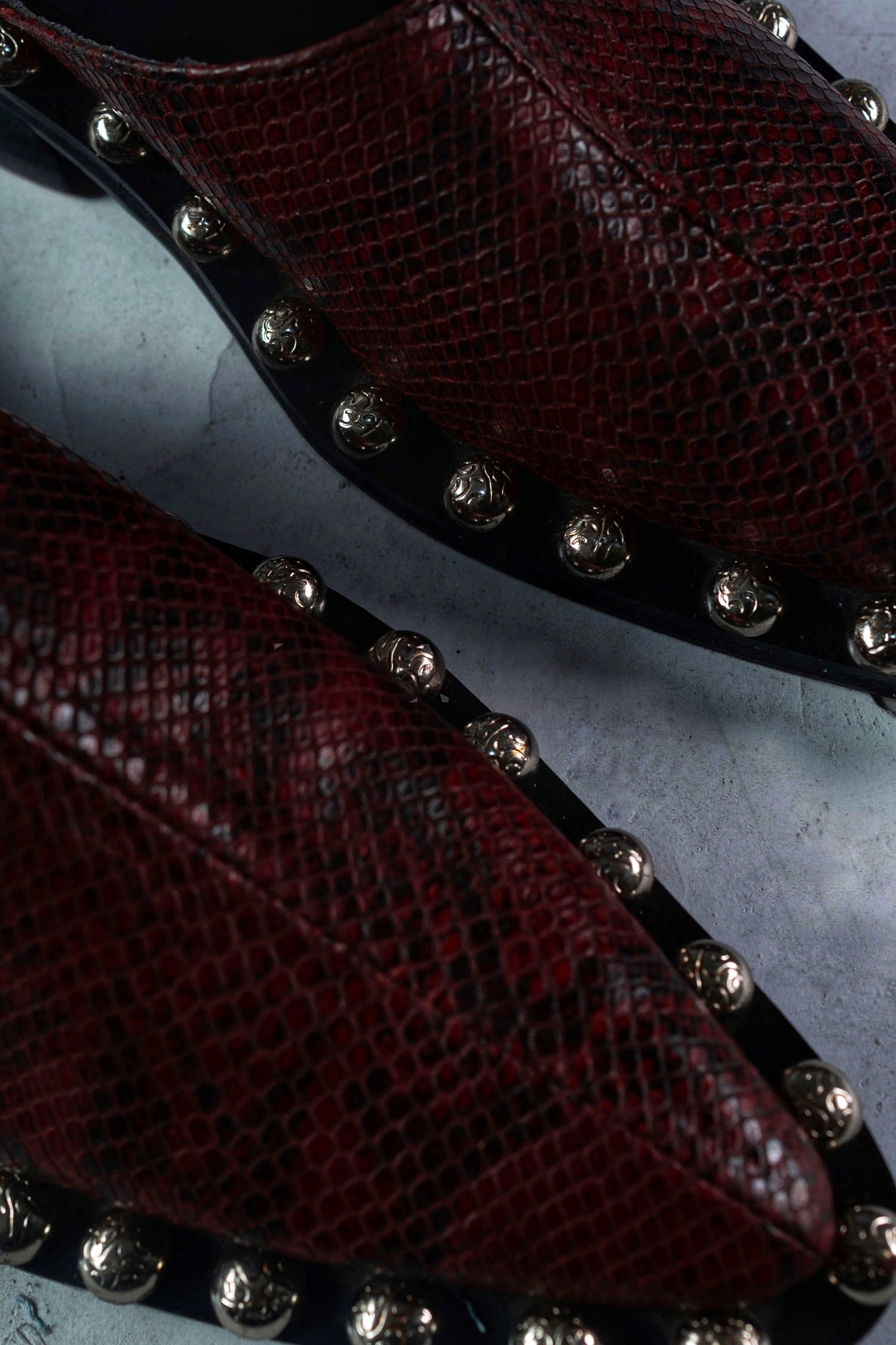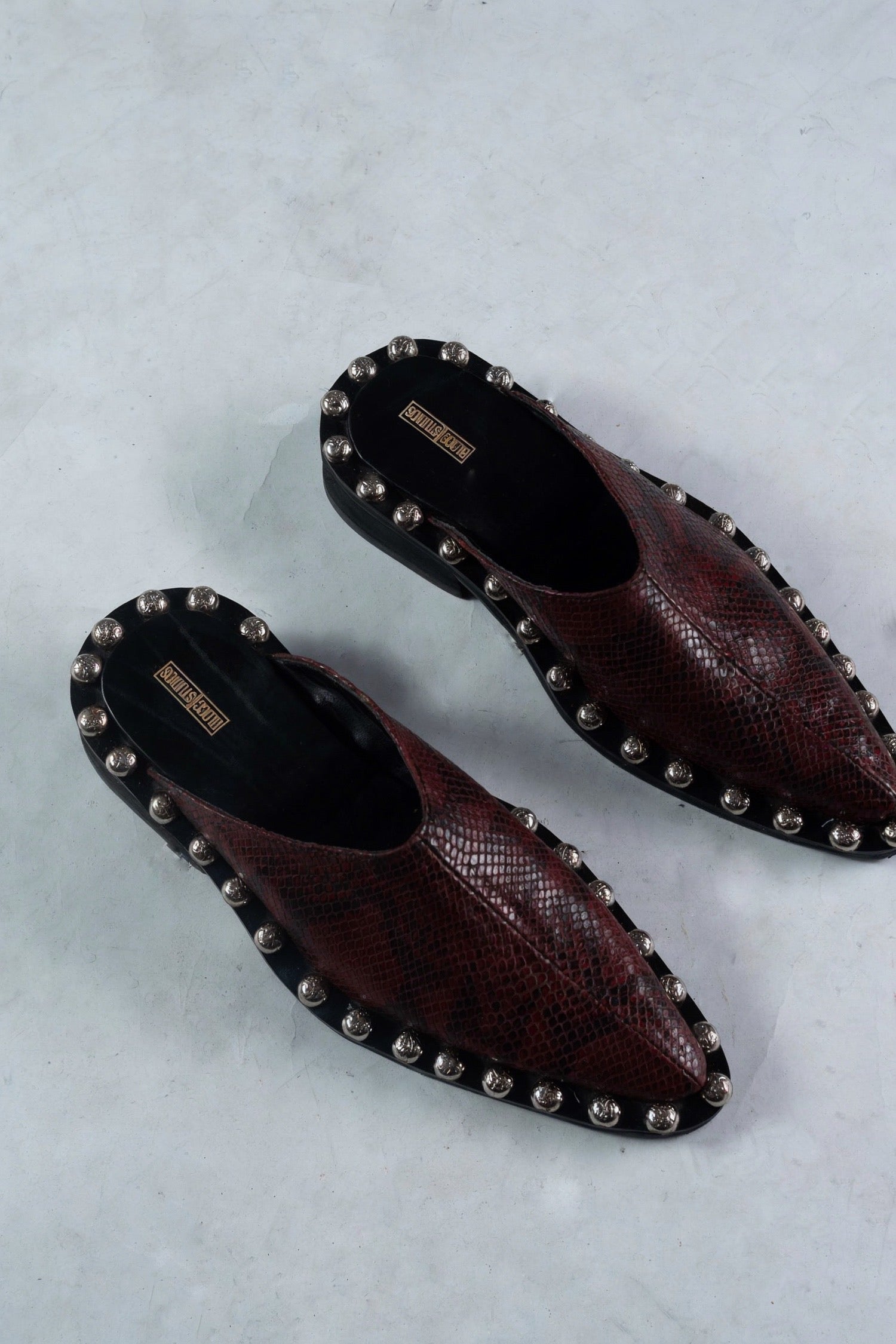 A bold silhouette that echoes defiance and quiet power. The Echo IV mule features a sharply contoured toe wrapped in deep burgundy python-embossed leather, elevated by hand-set silver studs along a matte black base. Designed for both him and her, this piece blurs boundaries between tradition and rebellion, elegance and edge.